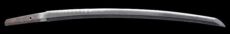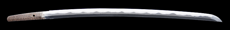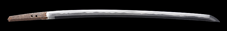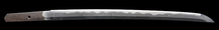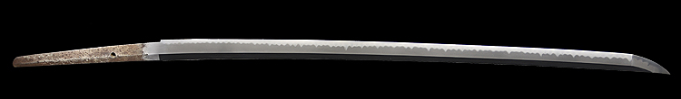 本造り庵棟 磨上茎 柾目肌、杢交じりよく詰む。地沸微塵につき、細かな地景顕われ白気風の映り立つ。刃紋は湾れに互の目、尖りごころの刃交じる。匂い口ややフックラと沸、小沸よくつく。沸足、小足、葉働く。金筋、砂流しかかり、明るく冴える。末古刀。北国物。黒呂塗鞘打刀拵(貴重刀装具)付き。(貴重刀剣)
