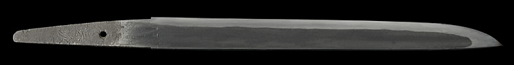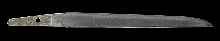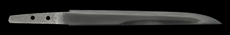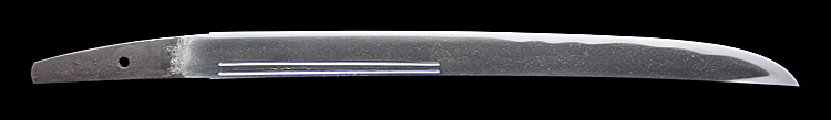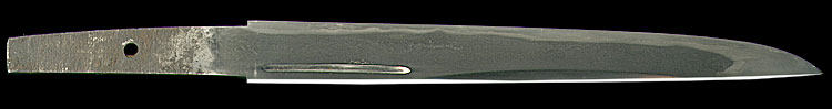 小烏丸造り庵棟 うぶ茎 小板目肌、柾交じりよく詰む。地沸微塵につき、細かな地景顕われ、淡く白気映り立つ。刃紋は中直刃浅く湾れて、小乱れ交じる。匂い口ややフックラと小沸つく。刃縁ほつれ、飛び焼、湯走りかかる。小足、葉働き、刃縁に金筋よく絡む。砂流しかかり明るく冴える。表裏に腰樋に添樋の彫刻。暗灰色塗海老鞘短刀拵付き。珍品。