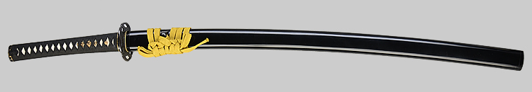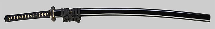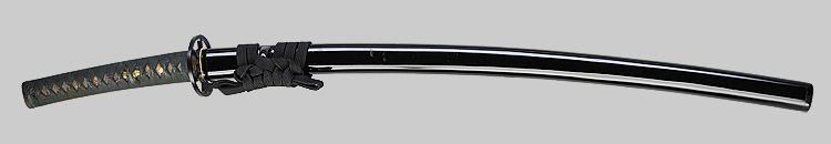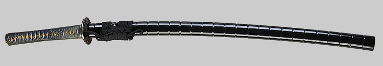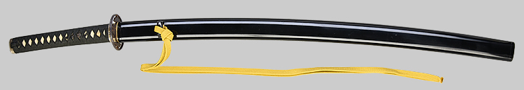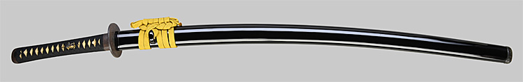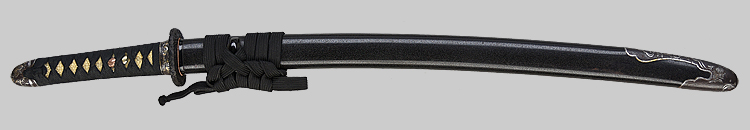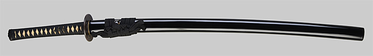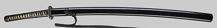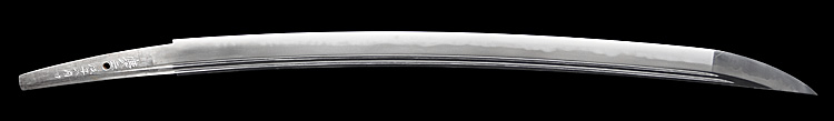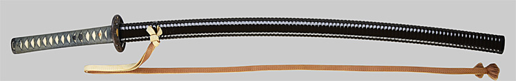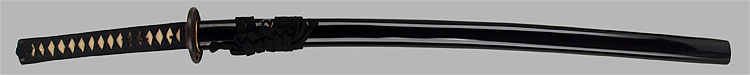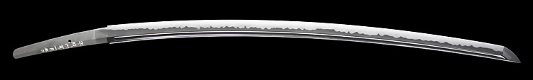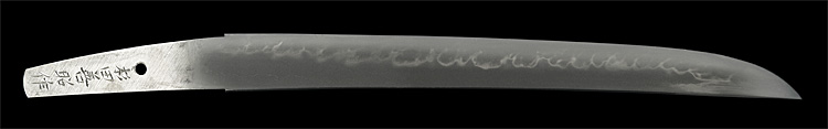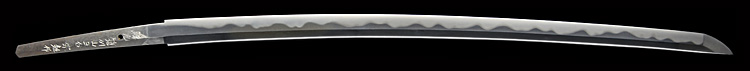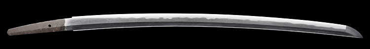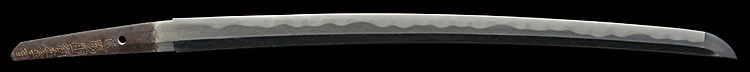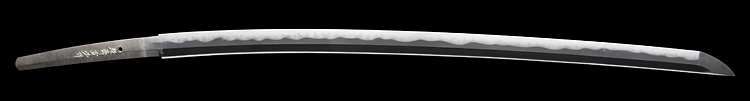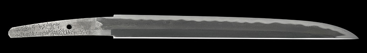 本造り庵棟 うぶ茎 柾目肌、小板目交じりよく詰む。地沸微塵につき、細かな地景顕われ、淡く沸映り立つ。刃紋は中直刃、浅く湾れて小乱れ交じる。匂い口締まり心に小沸よくつく。沸足、小足、葉盛んに働き、金筋、砂流しかかる。匂い口明るく冴える。本名は古山長蔵。水心子正秀の門。米沢住。黒呂塗鞘打刀拵付き。(特別保存刀剣)