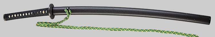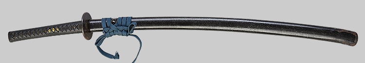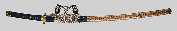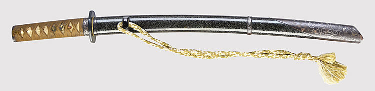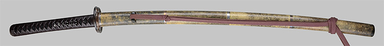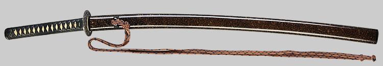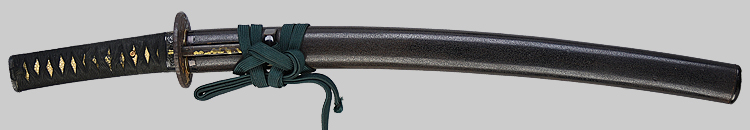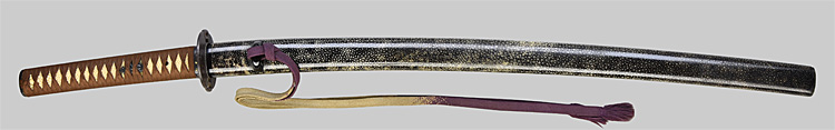 平造り庵棟 うぶ茎 小板目肌、杢交じりよく詰む。地沸微塵に厚くつき、細かな地景顕われ、淡く沸映り立つ。刃紋は湾れに互の目交じる。匂い口フックラと小沸よくつく。足、葉盛んに働き、金筋、砂流しかかる。匂い口明るく冴える。新古境の海部刀です。黒呂金散塗鞘小刀拵付き。(保存刀剣)