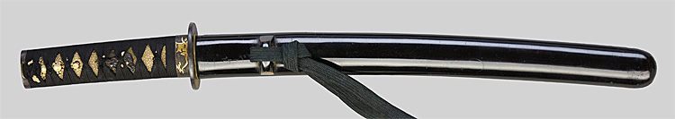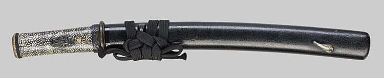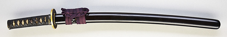 本造り庵棟 うぶ茎 板目肌、杢交じりよく詰む。地沸微塵につき、細かな地景顕われ、淡く沸映り立つ。刃紋は中直刃浅く湾れて小乱れ交じる。匂い口フックラと小沸よくつく。刃縁ほつれ、僅かに小足、葉働く。金筋、砂流しかかり、匂い口明るく冴える。久佐衛門という。越中守貞幸の門。黒呂塗鞘脇差拵付き。(特別保存刀剣)
