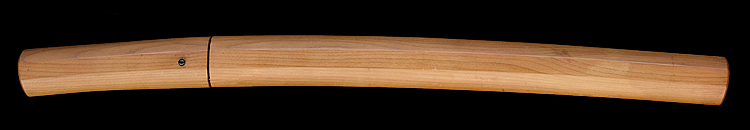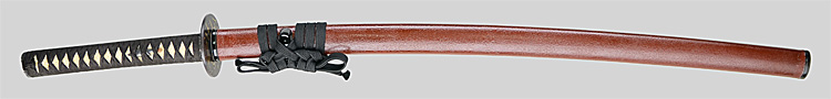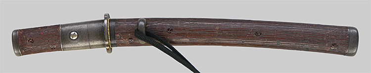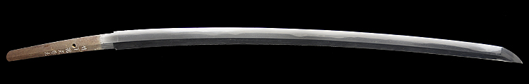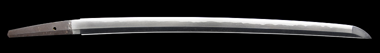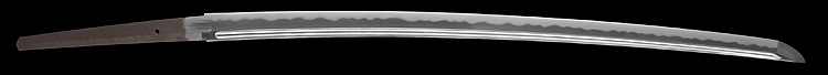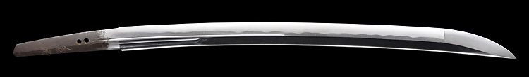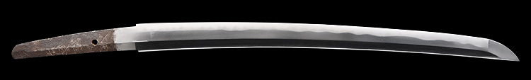 平造り庵棟 うぶ茎 板目肌、杢交じりよく詰む。地沸つき、細かな地景顕われ、淡く白気映り立つ。刃紋は互の目乱れ、尖り心の刃交じる。匂い口ややフックラと小沸つく。僅かに小足、葉働く。僅かに金筋、砂流しかかり、明るく冴える。焦茶色千段刻塗鞘合口拵付入り。