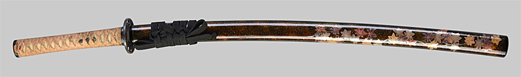 本造り庵棟 うぶ茎 小板目肌、柾交じりよく詰む。地沸微塵につき、細かな地景顕われ、淡く白気映り立つ。刃紋は湾れに互の目交じる。匂い口ややフックラと小沸よくつく。刃縁ほつれ、小足、葉働く。金筋、砂流しかかり、明るく冴える。出来良し。キズも無く綺麗に研ぎ上げてあります。黒呂秋草蒔絵鞘打刀拵付き。