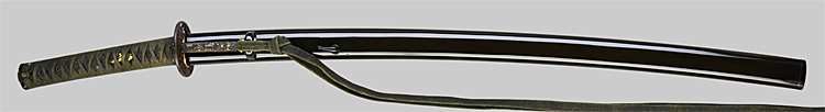 本造り庵棟 うぶ茎 小板目肌、柾交じりよく詰む。地沸つき、細かな地景顕われ、淡く白気映り立つ。刃紋は湾れに互の目交じる。匂い口やや深めに沸、小沸つく。匂い足、葉働く。金筋、砂流しかかり明るく冴える。関の軍刀鍛冶。戦後の作刀を見ない。黒呂塗鞘打刀拵入り。