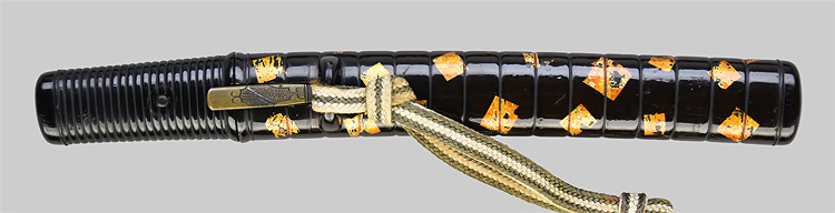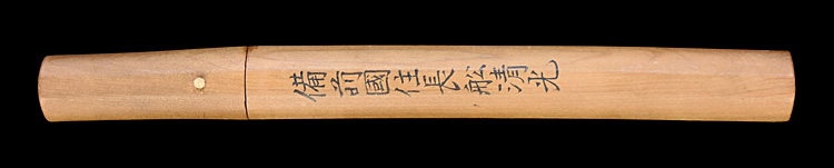 平造り三ツ棟 うぶ茎 板目肌、小板目交じりよく練れ見事に詰む。地沸微塵に厚くつき、細かな地景よく入り、淡く映り立つ。刃紋は中直刃、浅く湾れて小乱れ交じる。匂い口フックラと小沸よくつく。刃縁ほつれ、喰い違い刃、打の毛、小足、葉働く。金筋、砂流しかかり、匂い口明るく見事に冴える。姓は中川氏初代彦兵衛祐定の子。末備前の代表工。大業物。黒呂塗家紋蒔絵鞘合口拵付き。(入子鞘)鞘が入れ子になっています。(特別保存刀剣)