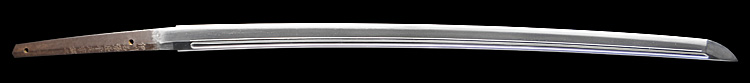 本造り庵棟 うぶ茎 小板目肌、杢交じりよく詰む。地沸つき、細かな地景顕われ、淡く白気映り立つ。刃紋は中直刃浅く湾れて小乱れ交じり、匂い深めに沸、小沸つく。刃中金筋、砂流しかかり、匂い口沈み心に冴える。出来良し、