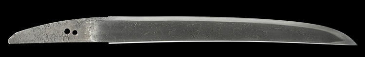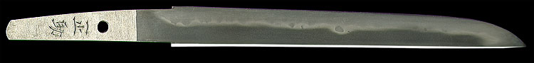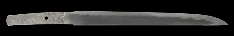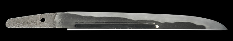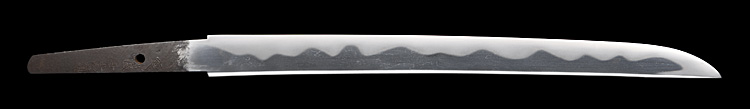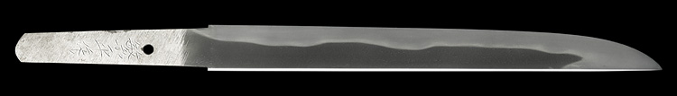 平造り庵棟 うぶ茎 小板目肌、杢交じりややザングリと肌立ちよく詰む。地沸微塵につき、細かな地景顕われ淡く白気映り立つ。刃紋は湾れに互の目、丁字、尖り刃交じる。匂い口ややフックラと小沸よくつく。湯走りかかり、僅かに足、葉働く。金筋、砂流しかかり、明るく冴える。黒石目塗鞘小刀拵付き。(保存刀剣)