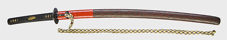 本造り庵棟 うぶ茎 板目肌、柾交じり詰む。地沸微塵につき、細かな地景顕われ、淡く白気映り立つ。刃紋は湾れに互の目、丁字、尖り刃交じる。匂い口フックラと小沸よくつく。湯走りかかり、小足、葉盛んに働く。金筋、砂流しかかり明るく冴える。表に棒樋に添樋、草の俱利伽羅,蓮台、裏に棒樋に添樋、梵字の彫刻。黒呂塗鞘打刀拵付き。三条吉則の子。伊勢、相州にても打つ。伊勢では村正に師事。彫刻の名手。暗朱模様塗鞘打刀拵付き。(刀剣保存会)