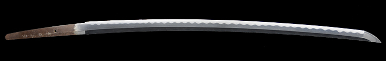 本造り庵棟 磨上茎 板目肌流れて杢交じりよく詰む。地沸微塵につき、細かな地景顕われ、白気風の映り立つ。刃紋は湾れに互の目、丁字、尖り刃交じる。匂い口やや深めに沸、小沸つく。湯走りかかり、足、葉働く。金筋、砂流しかかり、匂い口沈み心に冴える。二代金房。手掻の末流。十文字槍の名手。黒石目塗鞘打刀拵付き。(NPO保存会)