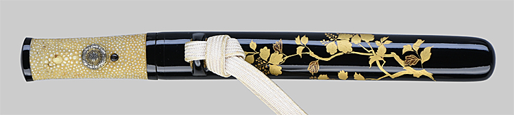 平造り庵棟 うぶ茎 柾目肌、板目交じりよく詰む。地沸微塵につき、細かな地景顕われ淡く映り立つ。刃紋は湾れに互の目交じる。匂い口フックラと小沸つく。湯走り打ちの毛かかり、小足葉働く。刃中に細かな金筋よく絡み、砂流しかかり明るく冴える。押水甚蔵、加州新々刀。出鮫朱塗鞘合口拵付き。(特別保存刀剣)