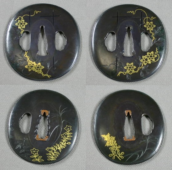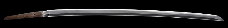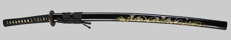 本造り庵棟 うぶ茎 小板目肌、柾交じりよく詰む。地沸微塵につき、細かな地景顕われ、淡く白気映り立つ。刃紋は湾れに互の目交じる。匂い口ややフックラと小沸よくつく。刃縁ほつれ、小足、葉働く。金筋、砂流しかかり、明るく冴える。出来良し。キズも無く綺麗に研ぎ上げてあります。黒呂秋草模様塗鞘打刀拵付き。