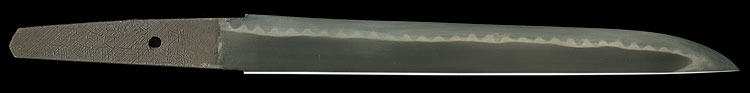 平造り庵棟 うぶ茎 板目肌、柾交じりよく詰む。地沸厚くつき、細かな地景顕われ淡く映り立つ。刃紋は互の目乱れがやや尖りごころに三本杉風に連なる。匂い口フックラと小沸よくつく。足よく入り葉働き、金筋、砂流しかかる。匂い口明るく冴える。固山宗次一族。青貝微塵塗鞘小刀拵付き。(保存刀剣)