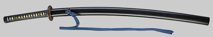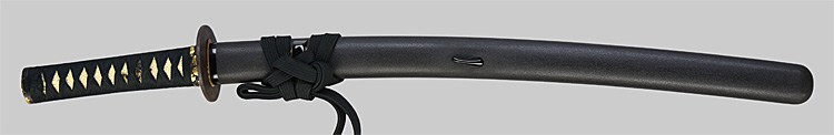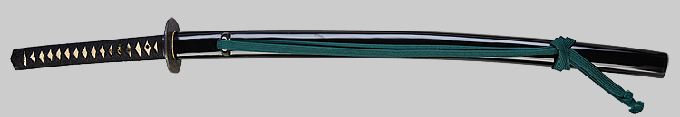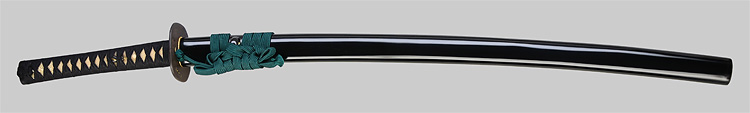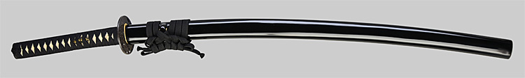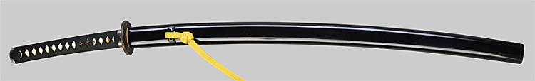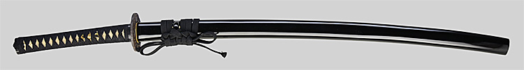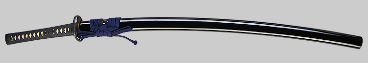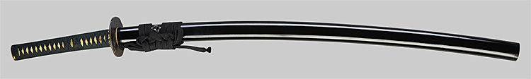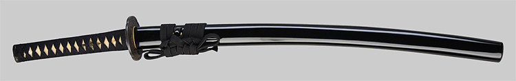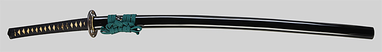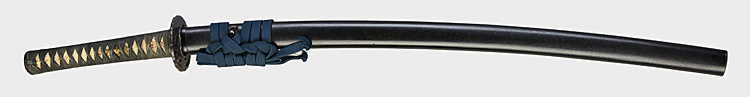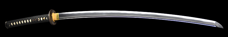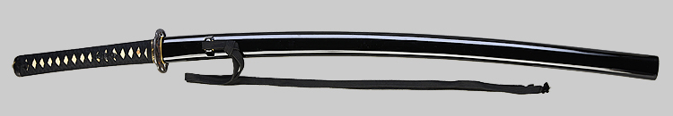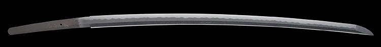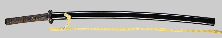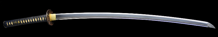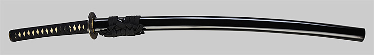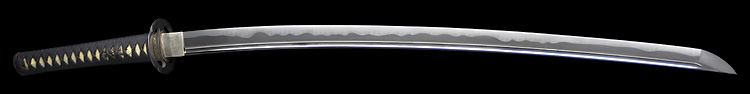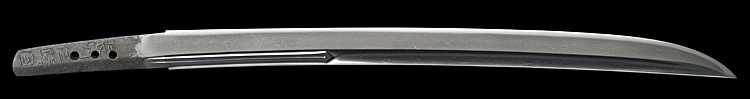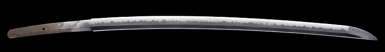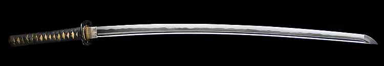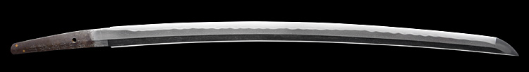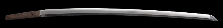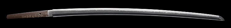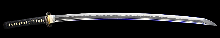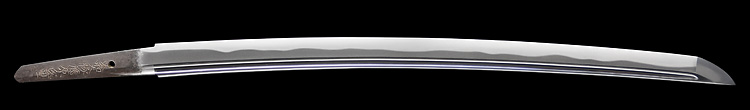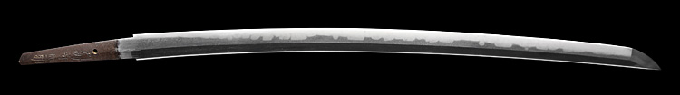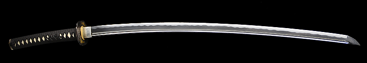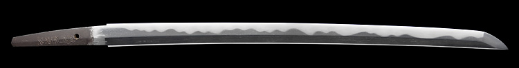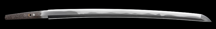 本造り庵棟 うぶ茎 柾目肌、小板目交じりよく詰む。地沸微塵につき、細かな地景顕われ、淡く沸映り立つ。刃紋は中直刃、浅く湾れて小乱れ交じる。匂い口締まり心に小沸よくつく。沸足、小足、葉盛んに働き、金筋、砂流しかかる。匂い口明るく冴える。本名は古山長蔵。水心子正秀の門。米沢住。黒呂塗鞘打刀拵付き。(特別保存刀剣)