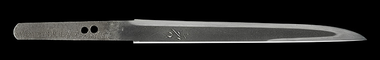 平造り庵棟 うぶ茎 小板目肌、柾交じりよく詰む。地沸微塵に厚くつき、細かな地景よく入り、淡く沸映り立つ。刃紋は中直刃、浅く湾れて小乱れ交じる。匂い口フックラと小沸よくつく。喰い違い刃かかり、僅かに小足、葉働く。金筋、砂流しかかり、匂い口明るく冴える。表に棒樋、裏に一筋樋の彫刻。善定兼吉門人。暗朱金散塗鞘合口拵付き。(特別保存刀剣)