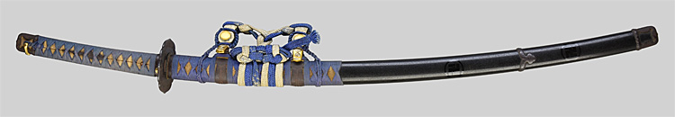 本造り庵棟 磨上茎 板目肌、柾交じりよく詰む。地沸微塵に厚くつき、細かな地景よく入り、淡く沸映り立つ。刃紋は湾れに互の目、丁字交じる。匂い口やや沈み心に沸、小沸よくつく。沸足、葉よく働き、金筋、砂流しかかる。匂い口沈み心に明るく冴える。表に腰樋、裏に護摩箸の彫刻。大左一門、左行弘の子。末左。青貝散塗鞘打刀拵付き。(特別保存刀剣)