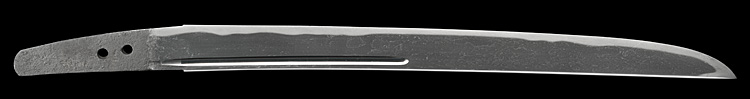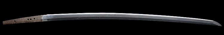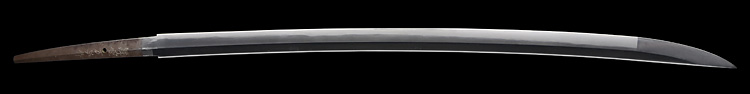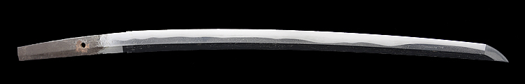 本造り庵棟 磨上茎 小板目肌、柾交じりよく詰む。地沸微塵に厚くつき、細かな地景顕われ、淡く映り立つ。刃紋は中直刃浅く湾れて、小互の目、尖り刃交じる。匂い口ややフックラと小沸よくつく。刃縁ほつれ、二重刃かかり、小足、葉働く。金筋、砂流しかかり、匂い口明るく冴える。室町前期の備後三原派。黒呂塗鞘打刀拵付き。(保存刀剣)