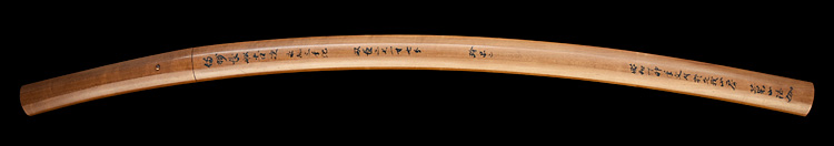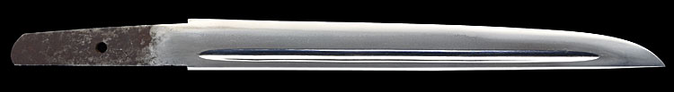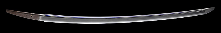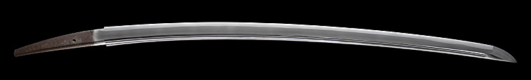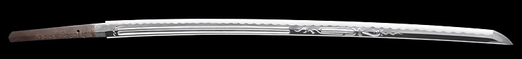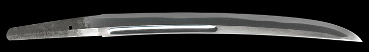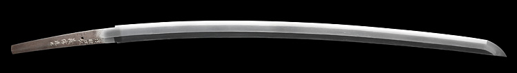 平造り庵棟 うぶ茎 板目肌、杢交じりよく練れよく詰む。地沸微塵に厚くつき、細かな地景よく入り、淡く映り立つ。刃紋は湾れに互の目交じる。匂い口フックラと小沸よくつく。湯走りかかり、足入り、葉見事に働く。金筋、砂流しかかり、明るく冴える。表に八幡大菩薩、裏に腰樋の彫刻。末備前、俗名入りの注文作。(特別保存刀剣)