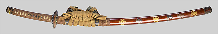 本造り庵棟 うぶ茎 小板目肌、杢交じりよく詰む。地沸微塵に厚くつき、細かな地景顕われ淡く白気風の映り立つ。刃紋は中直刃、淡く湾れて小乱れ交じる。匂い口ややフックラと小沸よくつく。刃縁ほつれ二重刃かかり小足、葉働く。金筋、砂流しかかり明るく冴える。本名は村岡新助。陸奥大掾源重栄の門。焦茶梨地塗家紋蒔絵鞘糸巻太刀拵付き。(特別保存刀剣)