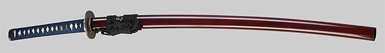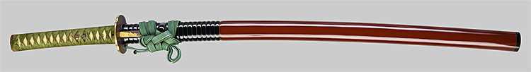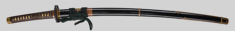 本造り庵棟 うぶ茎 小板目肌、杢交じりよく練れ詰む。地沸微塵に厚くつき、細かな地景よく入り、淡く沸映り立つ。刃紋は互の目、大互の目、丁字、尖り心の刃交じり涛乱風に乱れる。匂い口フックラと小沸よくつく。匂い足盛んに入り、葉働く。金筋、砂流しかかり、匂い口明るく見事に冴える。本名は坂倉言之進。美濃國照門の一門で初代越後守包貞の門人となる、初銘輝包のち越後守包貞と銘し、さらにそののち坂倉言之進照包と銘す。黒呂塗鞘打刀拵付き。(特別保存刀剣)