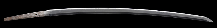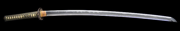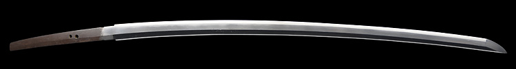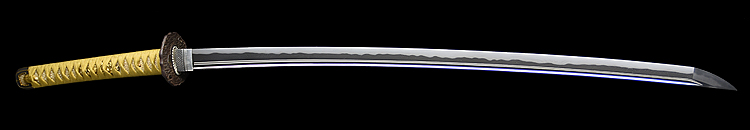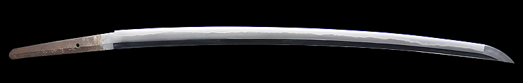 本造り庵棟 磨上茎 板目肌、杢交じりよく詰む。地沸微塵に厚くつき、地景良く入り、淡く乱れ映り立つ。地鉄精美。刃紋は細直刃、浅く湾れて小乱れ交じる。。匂い口フックラと小沸よくつく。刃縁ほつれ、二重刃、喰い違い刃、打ちの毛、湯走りかかる。僅かに小足入り、葉働く。金筋、砂流しかかり匂い口明るく冴える。本作は平安時代末期より鎌倉初期にかけての作です。真依の銘が鮮明に残されており大変貴重です。沃懸地蒔絵螺鈿桐花文鞘糸巻太刀拵付き。(特別保存刀剣)