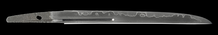 本造り庵棟 磨上茎 小板目肌、柾交じりよく詰む。地沸微塵につき、細かな地景顕われ、淡く白気映り立つ。刃紋は湾れに互の目、丁字、尖り刃交じる。匂い口フックラと小沸よくつく。匂い足、葉盛んに働く。金筋、砂流し頻りにかかり、匂い口明るく冴える。新刀期豊後高田を代表する刀工の一人です。(刀剣保存会)