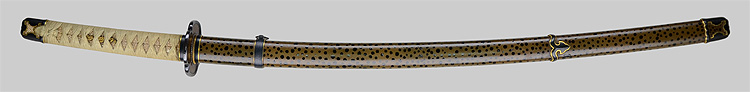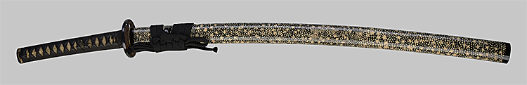 本造り庵棟 うぶ茎 小板目肌柾交じりよく詰む。地沸微塵につき、細かな地景顕われ、淡く沸映り立つ。刃紋は中直刃、浅く湾れて小乱れ交じる。匂い口締まり心に小沸よくつく。刃縁ほつれ、小足、葉働く。金筋、砂流しかかり匂い口明るく冴える。本名は藤原源右衛門。藤原高田。肥前にても打つ。近江大掾忠広との合作有り。金梨地家紋蒔絵鞘糸巻太刀拵付き。(保存刀剣)