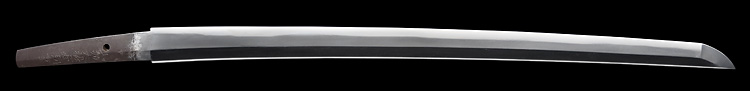 本造り庵棟 うぶ茎 小板目肌、柾交じりよく詰む。地沸微塵につき、細かな地景顕われ、淡く沸映り立つ。刃紋は広直刃、浅く湾れて小乱れ交じる。匂い口締まり心に小沸よくつく。細かな小足、葉盛んに働き、金筋、砂流しかかる。匂い口明るく冴える。二唐国吉同人。本名は二唐主呂。元陸軍受命刀匠。陸軍軍刀技術奨励会総裁賞。國工院会員名誉宗匠。海軍大臣賞。黒石目塗鞘打刀拵入り。