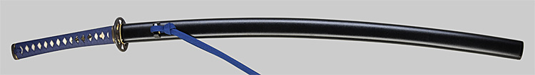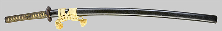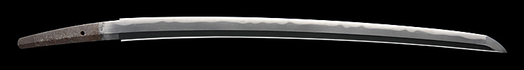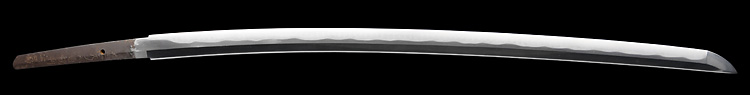 本造り庵棟 うぶ茎 板目肌、杢交じりややザングリと肌立ちよく詰む。地沸微塵に厚くつき、細かな地景よく入り、淡く沸映り立つ。刃紋は湾れに互の目、丁字、尖り心の刃交じる。匂い口深めによく沸づく、湯走り、飛び焼かかり、沸足、葉盛んに働く。金筋、砂流し頻りにかかり、匂い口明るく冴える。本名は高井金三郎。三品一派。平安城住。業物。黒呂塗鞘打刀拵付き。(特別保存刀剣)