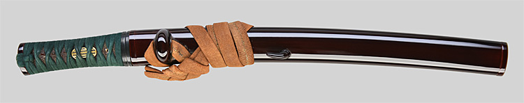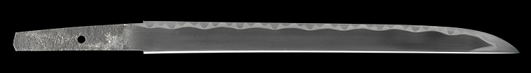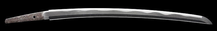 本造り庵棟 うぶ茎 小板目肌、杢交じりよく詰む。地沸微塵に厚くつき、細かな地景顕われ、淡く沸映り立つ。刃紋は見事な簾刃。匂い口深めに沸、小沸よくつく。刃中、足、葉盛んに働き、金筋、砂流し頻りにかかる。匂い口明るく冴える。本名は三品五郎兵衛。中丹波と称す。黒呂塗鞘脇差拵付き。(特別保存刀剣)