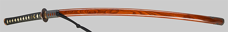 本造り庵棟 磨上茎 板目肌、杢交じりよく練れ、やや大肌顕われ詰む。地沸微塵につき、細かな地景顕われ乱れ映り立つ。刃紋は中直刃浅く湾れて小乱れ交じる。匂い口やや深めに小沸よくつく。湯走りかかり、小足、葉働く。金筋、砂流しかかり、匂い口明るく冴える。表裏に棒樋の彫刻。備前國和気荘の重則(古備前國宗派)重助(国分寺派)辺りの作と思われます。黒石目地卍紋散抜塗鞘糸巻太刀拵付き。(内外・特別保存)