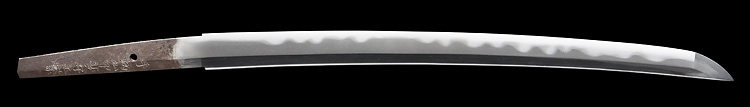 本造り庵棟 うぶ茎 小板目肌、柾交じりよく詰む。地沸微塵に厚くつき、細かな地景よく入り、淡く沸映り立つ。刃紋は互の目乱れ、丁字、尖り心の刃交じる。匂い口フックラと小沸よくつく。匂い足盛んに入り、葉働く。金筋、砂流しよくかかり、匂い口明るく冴える。表裏に棒樋に添樋の彫刻。加藤八郎。加藤國秀の子。綱秀弟。水心子正秀門人。黒石目塗鞘打刀拵付き。(特別保存刀剣)