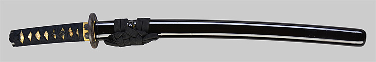 本造り庵棟 磨上茎 小板目肌、柾交じりよく詰む。地沸微塵に厚くつき、細かな地景顕われ、淡く乱れ映り立つ。刃紋は互の目乱れ、丁字、小丁字、尖り心の刃交じる。匂い口締まり心に小沸よくつく。匂い足、葉盛んに働き、金筋、砂流し頻りにかかる。匂い口明るく見事に冴える。本名は細川政蔵。水心子正秀の門。作州津山藩工。直胤と並ぶ水心子一門の代表工。黒呂塗鞘打刀拵付き。(特別保存刀剣)