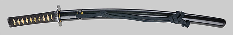 本造り庵棟 うぶ茎 小板目肌、柾交じりよく詰む。地沸微塵につき、細かな地景顕われ、淡く映り立つ。刃紋は互の目丁字乱れ、尖り心の刃交じる。匂い口ややフックラと小沸よくつく。飛び焼き、湯走りかかり、小足、葉働く。金筋、砂流しかかり、明るく冴える。表裏に棒樋の彫刻。徳島の名工杉山正俊の師。黒呂塗鞘打刀拵入り。(940g)