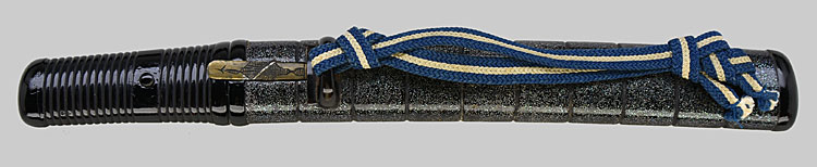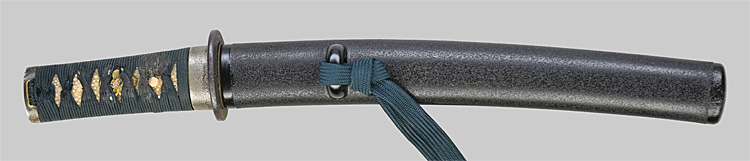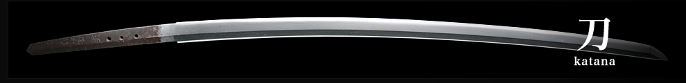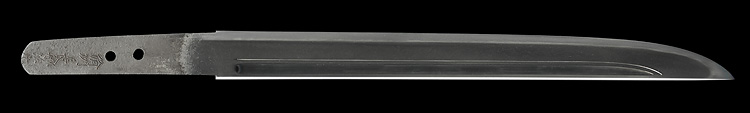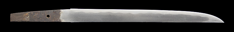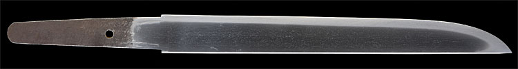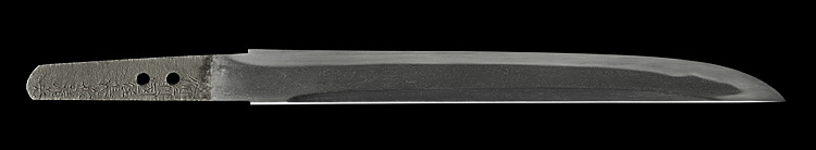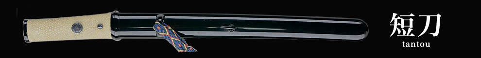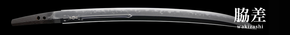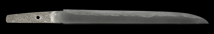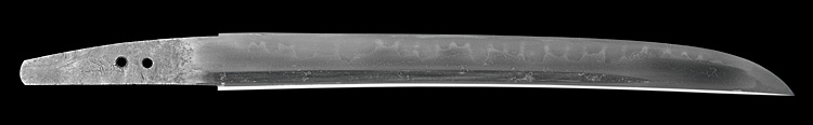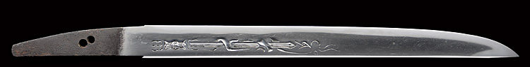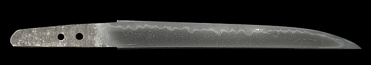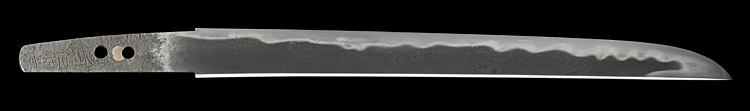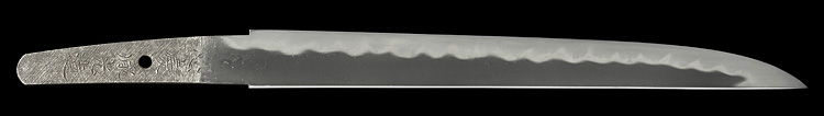 平造り庵棟 うぶ茎 板目肌、柾交じり、やや肌立ちよく詰む。地沸微塵に厚くつき、細かな地景顕われ淡く白気映り立つ。刃紋は湾れに互の目、丁字、尖り心の刃交じる。匂い口フックラと小沸よくつく。飛び焼きかかり匂い足、葉働く。金筋、砂流しかかり、匂い口明るく冴える。末関。出鮫黒呂塗鞘合口拵付き。(特別保存刀剣)