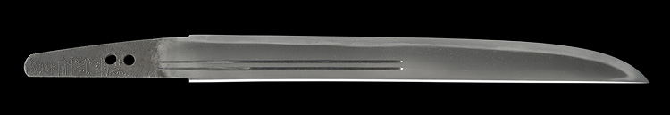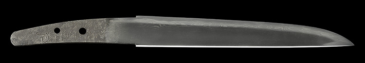 諸刃造り庵棟 うぶ茎 小板目肌、杢交じりよく詰む。地沸微塵につき、細かな地景顕われ、白気映り立つ。刃紋は互の目乱れ、尖り刃交じる。匂い口ややフックラと小沸よくつく。匂い足、小足、葉働く。金筋、砂流しかかり、明るく冴える。表裏に薙刀樋の彫刻。(保存刀剣)
