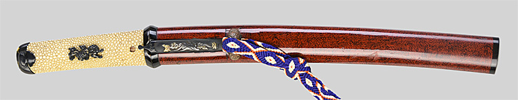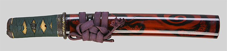 平造り三ツ棟 うぶ茎 板目肌、杢交じりやや肌立ちよく練れ詰む。地沸微塵に厚くつき、細かな地景よく入り、淡く沸映り立つ。刃紋は中直刃、浅く湾れて小乱れ交じる。匂い深めに沸、小沸よくつく。刃縁ほつれ、小足、葉働き、湯走り、喰い違い刃かかる。金筋、砂流しかかり、匂い口明るく冴える。表に爪に素剣、裏に蓮台に護摩箸の彫刻。本名は藤田徳次郎、のちに謙吾。真龍子と号す。加賀介祐永の門。長州萩のちに周防国山口に住す。出鮫朱塗家紋蒔絵鞘合口拵え付き。(特別保存刀剣)