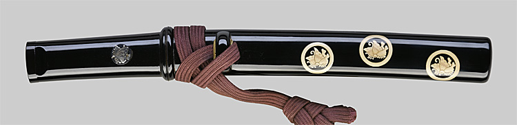 平造り庵棟 うぶ茎 柾目肌よく詰み、地沸微塵に厚くつく。細かな地景顕われ、淡く白気風の映り立つ。刃紋は中直調子、浅く湾れて小乱れ交じる。匂い口やや深めに沸、小沸よくつく。刃縁ほつれ、湯走り、喰い違い刃かかる。小足、葉働き、金筋、砂流しかかる。匂い口明るく冴える。越前下坂。業物。黒石目塗家紋陰蒔絵鞘小刀拵付き。(特別保存刀剣)