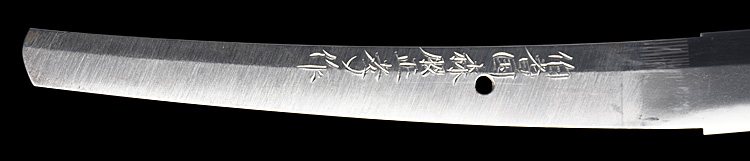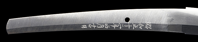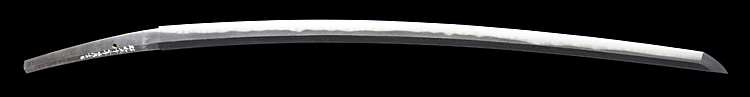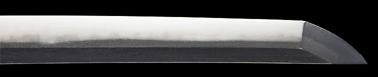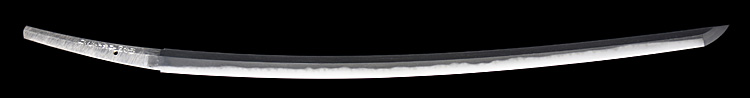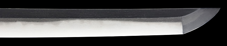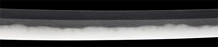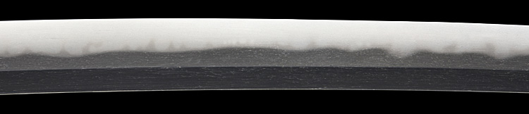 本造り庵棟 うぶ茎 小板目肌、杢交じりやや肌立ち心によく詰む。地沸微塵に厚くつき、細かな地景顕われ、淡く沸映り立つ。刃紋は互の目丁字乱れ、尖り刃交じる。匂い口やや深めに沸、小沸よくつく。湯走りかかり、沸足、葉盛んに働く。金筋、砂流し頻りにかかり匂い口明るく冴える。本名森脇要。金一郎の子。國工院会員宗匠。靖国鍛錬会入会、梶山靖徳、池田靖光、小谷靖憲に師事、勲四等瑞宝章。藍綬褒章。黒呂塗鞘打刀拵付き。