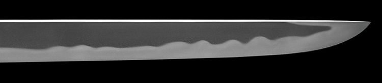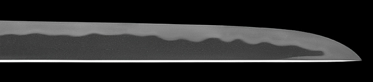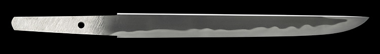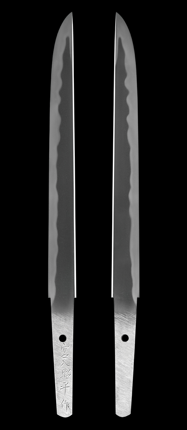 平造り三ツ棟 うぶ茎 小板目肌、杢交じりよく練れ詰む。地沸微塵に厚くつき、細かな地景よく入り、淡く沸映り立つ。刃紋は湾れに互の目、交じる。匂い口フックラと沸、小沸よくつく。沸足、葉働き、金筋、砂流しよくかかる。匂い口明るく冴える。本名は宮入堅一。人間国宝。栗原彦三郎の門。元陸軍受命刀匠。陸軍軍刀技術奨励会会長賞。國工院会員権大宗匠。(特別保存刀剣)