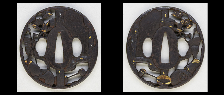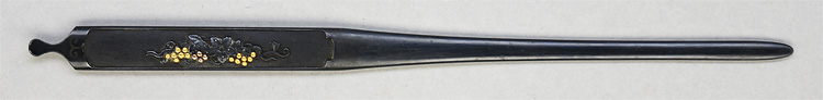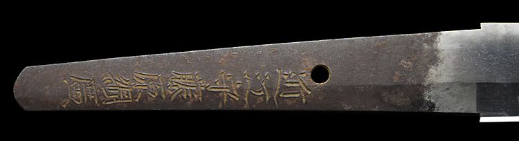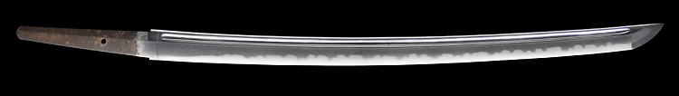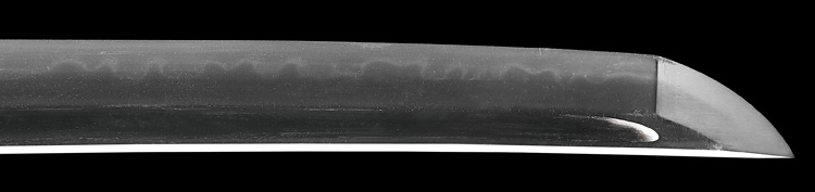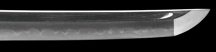 本造り庵棟 うぶ茎 小板目肌、杢交じりよく詰む。地沸微塵に厚くつき、細かな地景顕われ、淡く沸映り立つ。刃紋は互の目乱れ、丁字、尖り心の刃交じる。匂い口フックラと小沸よくつく。匂い足、葉働き、金筋、砂流しかかる。匂い口明るくよく冴える。表裏に棒樋の彫刻。一法子と号す。伊勢吉広同人。黒呂塗鞘脇差拵付き。(特別保存刀剣)