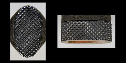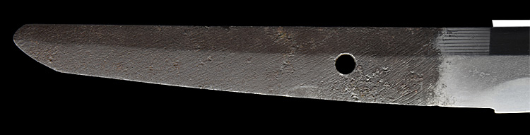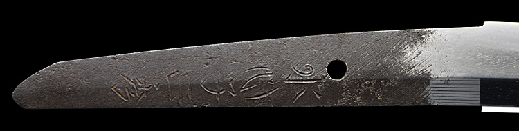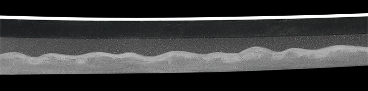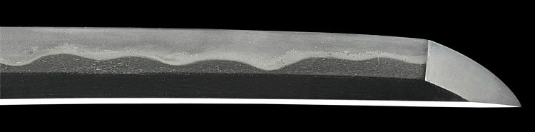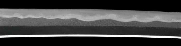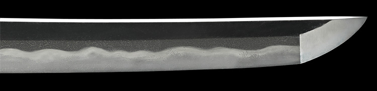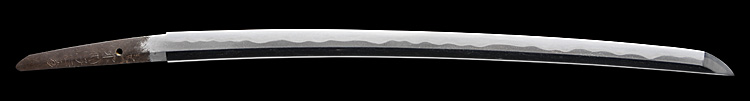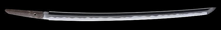 本造り庵棟 うぶ茎 小板目肌、杢交じりややザングリと肌立ちよく詰む。地沸微塵に厚くつき、細かな地景よく入り、淡く沸映り立つ。刃紋は互の目乱れ、尖り刃交じる。匂い口ややフックラと沸、小沸よくつく。小足、葉働き、金筋、砂流しよくかかる。匂い口明るく冴える。本名は川部儀八郎。四代國包門人。秋元家抱工。刀剣復古論を唱え(刀剣武用論)を刊行。刀剣界の一大教育者。新々刀最上作。暗朱塗勝虫蒔絵鞘脇差拵付き。(特別保存刀剣)