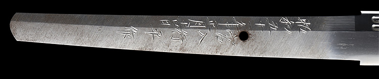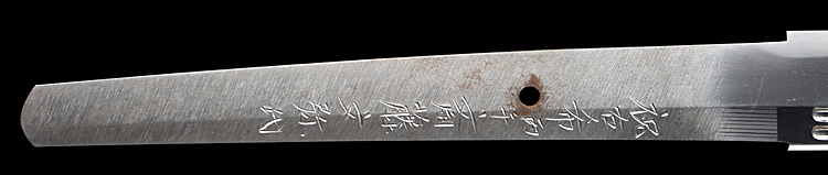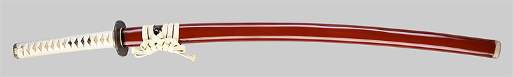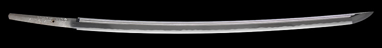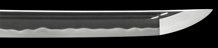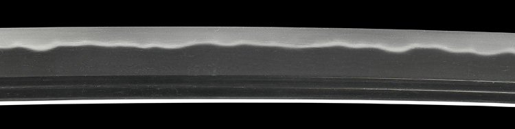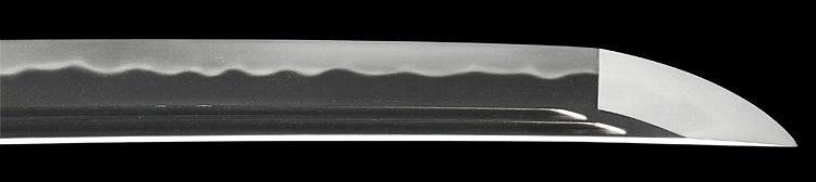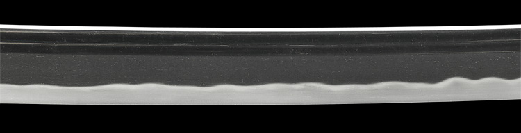 本造り三ツ棟 うぶ茎 板目肌、杢交じりよく練れ詰む。地沸微塵に厚くつき、細かな地景よく入り、淡く沸映り立つ。刃紋は湾れに互の目、尖り心の刃交じる。匂い口フックラと小沸よくつく。匂い足、葉盛んに働き、金筋、砂流し頻りにかかる。匂い口明るく見事に冴える。本名は宮入堅一。人間国宝。栗原彦三郎の門。元陸軍受命刀匠。陸軍軍刀技術奨励会会長賞。國工院会員権大宗匠。暗朱塗鞘打刀拵付き。(特別保存刀剣)