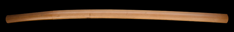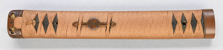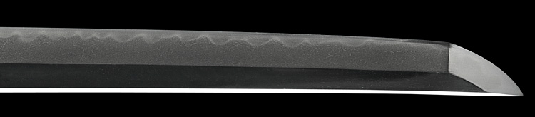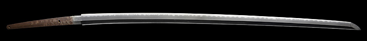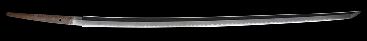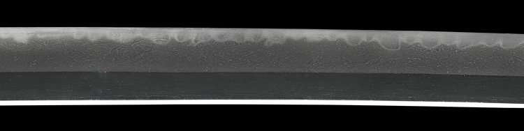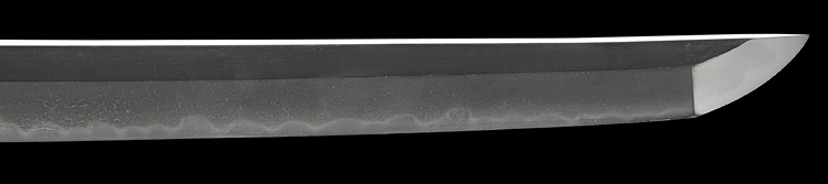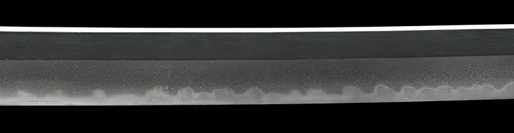 本造り庵棟 うぶ茎 小板目肌、杢交じりややザングリと肌立ちよく練れ詰む。地沸微塵に厚くつき、細かな地景よく入り、沸映り立つ。刃紋は互の目乱れ、丁字、尖り心の刃交じる。匂い口フックラと小沸よくつく。足、葉盛んに働き、金筋、砂流しよくかかる。匂い口明るく冴える。豪壮。本名は藤田徳次郎、のちに謙吾。真龍子と号す。横山加賀介祐永の門。長州萩に住し、のちに周防國山口に移住。銅金具黒呂刻塗鞘太刀拵付き。(特別保存刀剣)