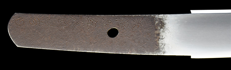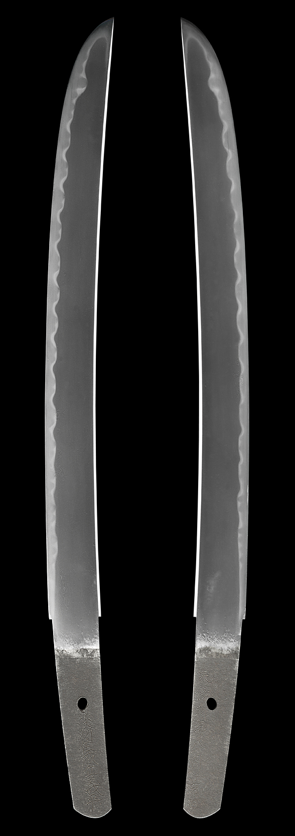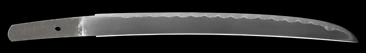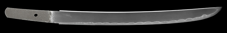 平造り庵棟 うぶ茎 小板目肌、杢交じりよく詰む。地沸微塵に厚くつき、細かな地景顕われ淡く沸映り立つ。刃紋は互の目乱れ、尖り心の刃交じる。匂い口フックラと小沸よくつく。僅かに匂い足、葉働き、金筋、砂流しかかる。匂い口明るくよく冴える。備前横山祐平の門 俗に骨切り義平という。(特別保存刀剣)