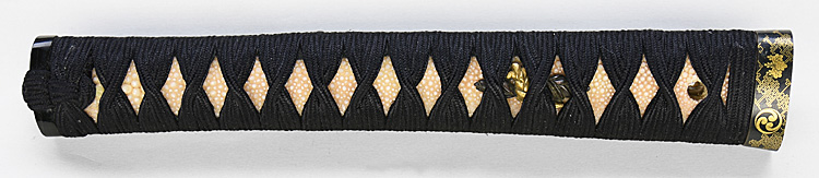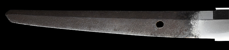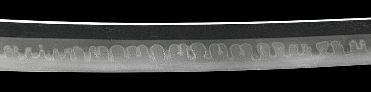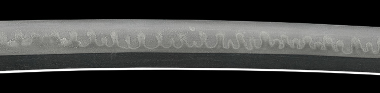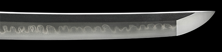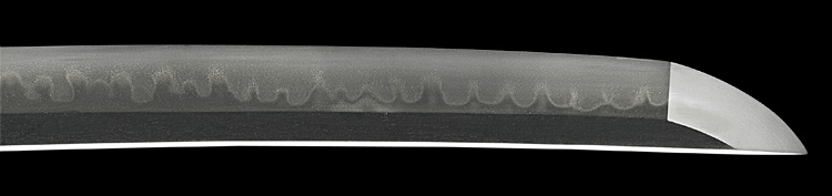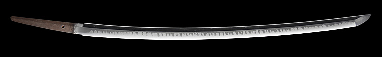 本造り庵棟 うぶ茎 板目肌、柾交じりよく詰む。地沸微塵に厚くつき、細かな地景よく入り、乱れ映り立つ。刃紋は互の目丁字、尖り心の刃交じり重花風に乱れる。焼き高く華やか。匂い口フックラと小沸よくつく。飛び焼きかかり匂い足、葉働く。頻りに金筋、砂流しかかり、匂い口明るく見事に冴える。三条吉則の末裔。本国丹後宮津。越前兼法門人。良業物。出来見事。黒呂塗鞘打刀拵付き。(特別保存刀剣)