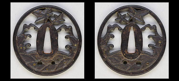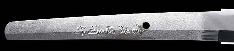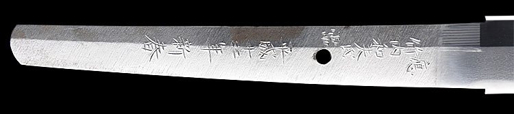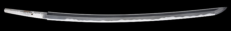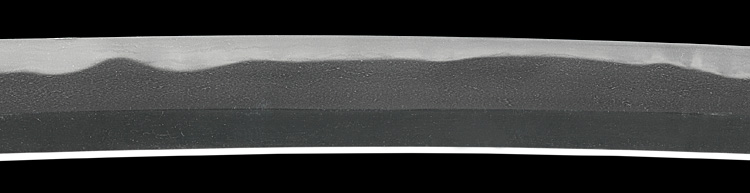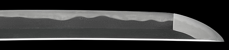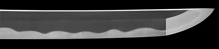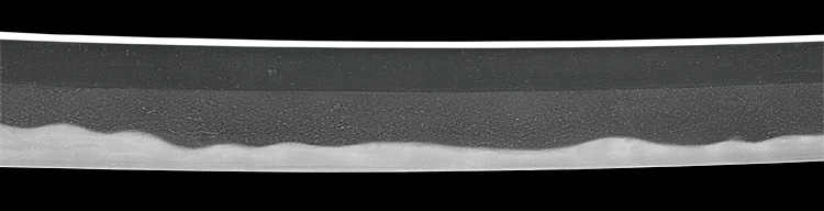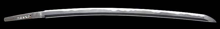 本造り庵棟 うぶ茎 小板目肌、杢交じりよく詰む。地沸微塵に厚くつき、細かな地景顕われ、淡く沸映り立つ。刃紋は湾れに互の目丁字、尖り心の刃交じる。匂い口やや深めに沸、小沸よくつく。沸足、葉盛んに働く。金筋、砂流し頻りにかかり、匂い口明るく冴える。出来良し。本名は古川信夫。宮入清平の門。無鑑査。黒呂塗鞘打刀拵付き。