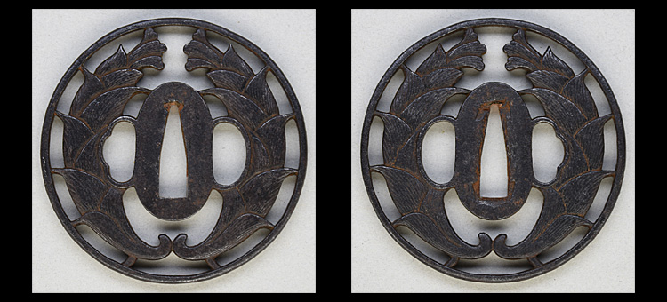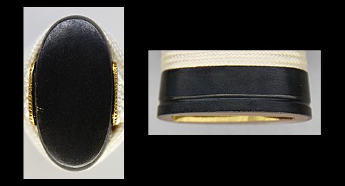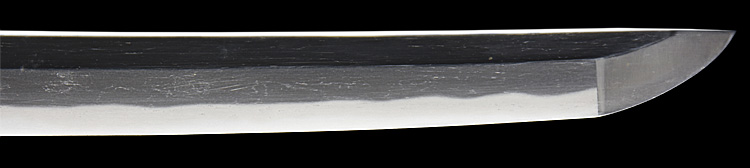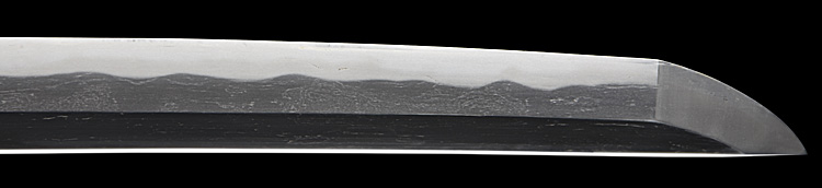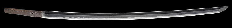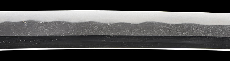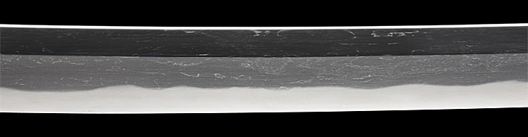 本造り庵棟 うぶ茎 板目肌、杢交じり、やや大肌顕われ詰む。地沸厚くつき、細かな地景顕われ、乱れ映り立つ。刃紋は湾れに互の目、丁字、尖り刃交じる。匂いやや深めに沸、小沸よくつく。足、葉盛んに働き、金筋、砂流し頻りにかかる。匂い口やや沈み心に冴える。末備前、戦国時代の清光です。黒呂塗鞘打刀拵付き。(保存刀剣)