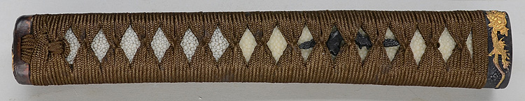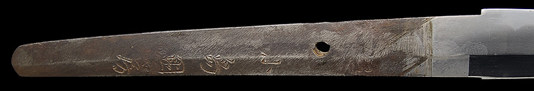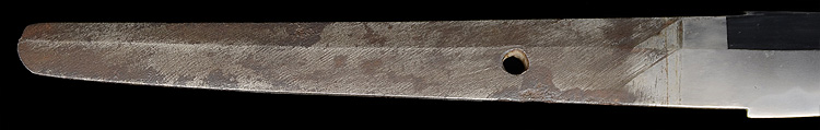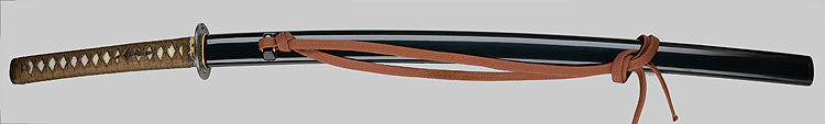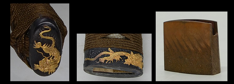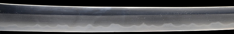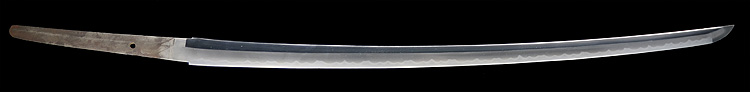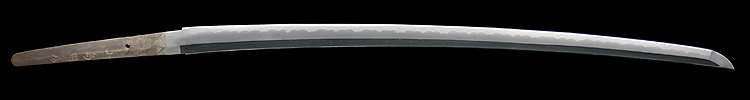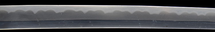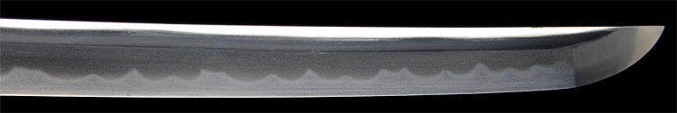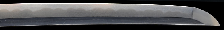 本造り庵棟 うぶ茎 小板目肌よく詰み、地沸厚くつく。細かな地景顕われ淡く白気風の映り立つ。刃紋は尖り互の目、三本杉風に乱れる。匂い口ややフックラと小沸つく。僅かに足、葉働き、僅かに金筋、砂流しかかり明るく冴える。関。本名は小島勇三。戦後の作刀を見ない。黒呂塗鞘打刀拵入り。