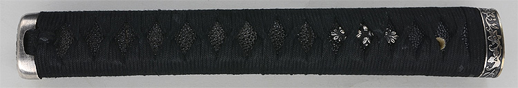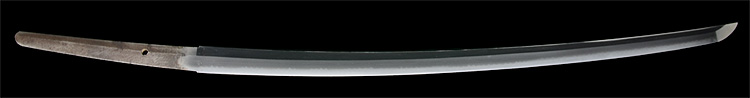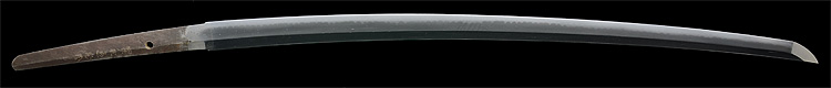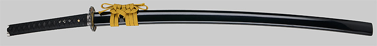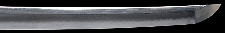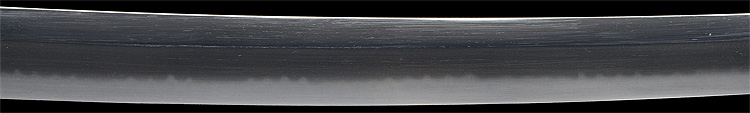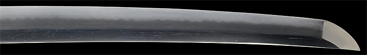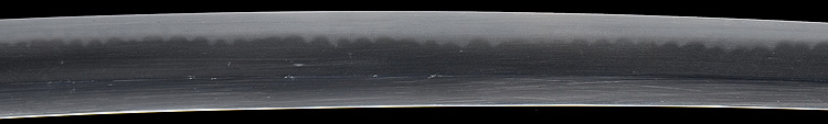 本造り庵棟 うぶ茎 小板目肌、柾交じりよく詰む。地沸厚くつき、細かな地景顕われ淡く白気風の映り立つ。刃紋は湾れに小互の目、尖り刃交じる。匂い口ややフックラと小沸つく。足、葉よく働き、金筋、砂流しかかり明るく冴える。本名は山田金次郎。関善定兼吉の門。黒呂塗鞘打刀拵入り。