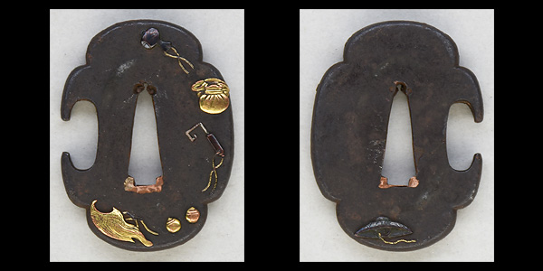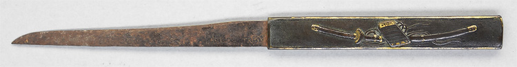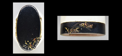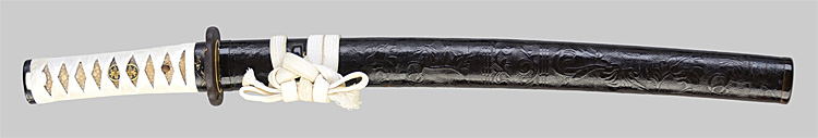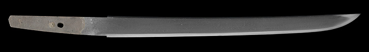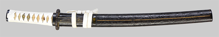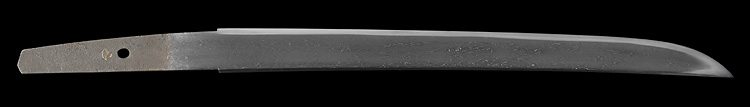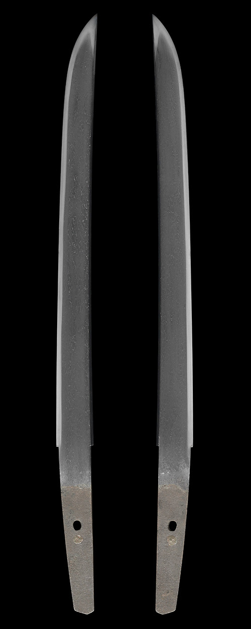 平造り庵棟 うぶ茎 板目肌、柾交じりよく詰む。地沸微塵につき、細かな地景顕われ、淡く白気風の映り立つ。刃紋は細直刃浅く湾れて、小乱れ交じる。匂い口締まり心に小沸よくつく。僅かに小足、葉働き、金筋、砂流しかかり明るく冴える。黒変模様塗鞘小刀拵入り。